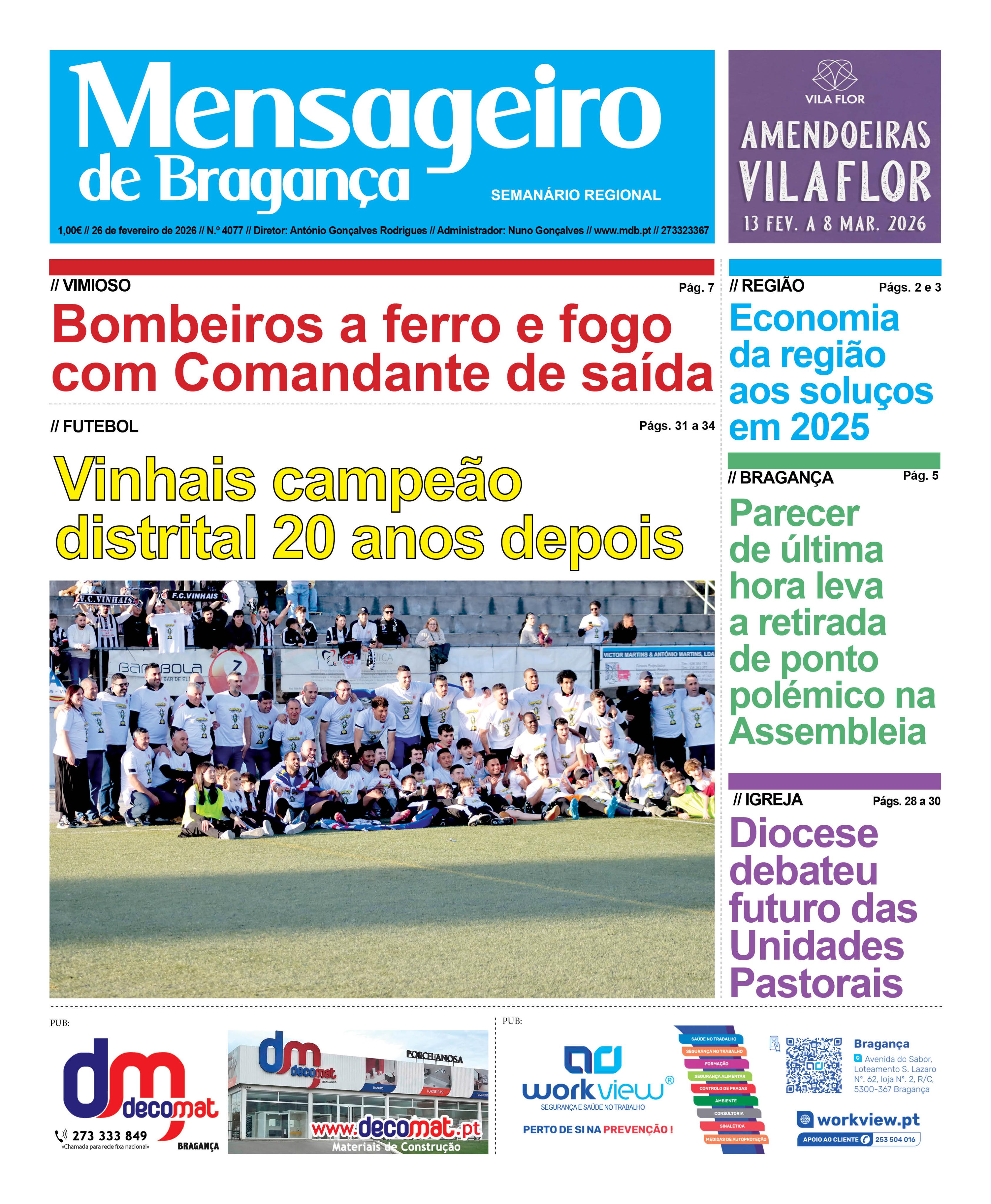 Data Edição Qui, 02/26/2026 - 12:00 Versão completa em PDF, disponível para assinantes. Informação acerca das assinaturas aqui Para fazer login aqui Notícias nesta edição: CDU convoca reunião com presidentes de junta abrangidos pela prospeção “Avidagos” Parecer de última hora leva Isabel Ferreira a retirar ponto de discussão da Assembleia Municipal Tribunal mantém valor patrimonial tributário da barragem de Miranda Município vai investir 700 mil euros em centro interpretativo do Douro Internacional Barragem do Baixo Sabor beneficia populações em caso de cheia e prejudica agricultura GNR reforça meios náuticos na região em tempo de aniversário Passos Coelho considera novo livro de Jorge Nunes “um contributo para que se possa ser mais profícuo” no trabalho autárquico Isabel Ferreira quer lançar projetos para o futuro de Bragança porque o “partido mais importante é o do território” Vários deputados municipais não vão receber valor das senhas de presença por saída injustificada da reunião Proposta de criação de 16 cargos dirigentes na câmara só passa com voto de qualidade Assembleia chumba proposta da Câmara de delegar na CIM-TTM competências das infrações rodoviárias PCP questiona Governo sobre o projeto da Central Fotovoltaica do Planalto Apresentado o livro “Máscaras – Rituais de Portugal | Coleção de Roberto Afonso” Terra Fria com 25 novas viaturas prontas para reforçar a limpeza urbana Trabalho das Unidades Pastorais esteve em análise em Bragança D. Nuno Almeida pede oração por “quem vive apático em relação à comunidade” Jovens universitários da Missão País deixam a cidade comovida com as ações de fé Polo de Cultura e Ciência da Universidade Aberta já abriu portas Bragança Granfondo renova percursos e aponta a 1500 participantes na oitava edição Hernâni Dias anuncia recandidatura à Distrital do PSD Opiniões nesta edição: Editorial - António Gonçalves RodriguesA pergunta do milhão de euros DECOTempestades causam prejuízos avultados e deixam consumidores sem serviços essenciais Jorge NovoCada um por si José Mário LeiteCiência Cidadã António Bárbolo Alves“Las lhénguas son puortas que s’ábren rechinando para cousas que nun eijísten” José Tolentino Mendonça, ‘Bocca della Verità Manuel PereiraASSUNTO–“IMPOSTO SOBRE O RENDIMENTO DAS PESSOAS SINGULARES-IRS” F. Costa AndradeComo depressa e bem não há quem, também quem tem pressa come cru!